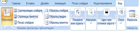 Команды, относящиеся к вкладке Вид, обеспечивают выбор различных режимов просмотра презентации, отображение-сокрытие элементов интерфейса и изменение масштаба, а также изменение расположения окон на экране: