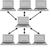 В топологии типа «звезда» все компьютеры подсоединены к одной центральной машине, которая, как правило, бывает мощнее, чем присоединяемые к ней. Все информационные потоки в сети проходят через центральный компьютер. Схематически такая топология может быть изображена в виде: