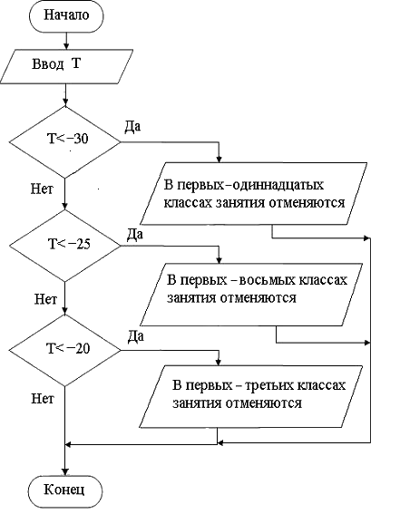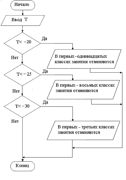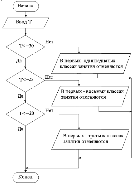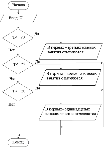 градусов – в первых–одиннадцатых классах школ. Блок-схема алгоритма, реализующего регламент школьных занятий при понижении температуры, имеет вид …