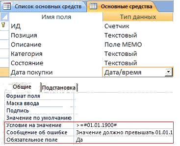 Можно также использовать свойство Условие на значение, чтобы ограничить ввод только определенными значениями, и свойство Сообщение об ошибке для предупреждения пользователей об ошибках. Все свойства полей доступны в Режиме конструктора