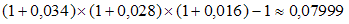 На основании данных об уровне инфляция за три года, который составил 3,4, 2,8 и 1,6 % соответственно, можно сделать вывод, что инфляция за указанный период оказалась равна ___ %.