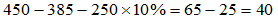 В некотором государстве доходы бюджета составили 385 ден. ед., расходы бюджета – 450 ден. ед., деньги внебюджетных фондов – 35 ден. ед., государственный долг – 250 ден. ед., платежи по госдолгу – 10% в год. Первичный дефицит бюджета составляет ____ ден. ед.