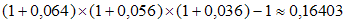 На основании данных об уровне инфляция за три года, который составил 6,4, 5,6 и 3,6 % соответственно, можно сделать вывод, что инфляция за указанный период оказалась равна ___ %.