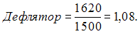 Дефлятор = 1,08. Если дефлятор больше 1, то произошла инфляция, то есть рост цен. При дефляторе меньше 1 цены снизились. Следовательно, цены увеличились на 8 %.