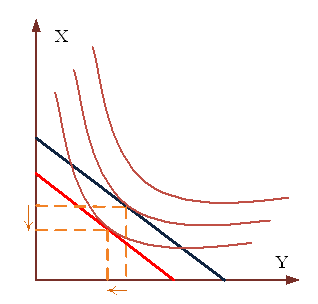 Уменьшение номинального дохода потребителя при прочих равных условиях делает его реально богаче, то есть он может купить меньше и товара X, и товара Y. На графике это отразится параллельным сдвигом линии бюджетного ограничения влево: