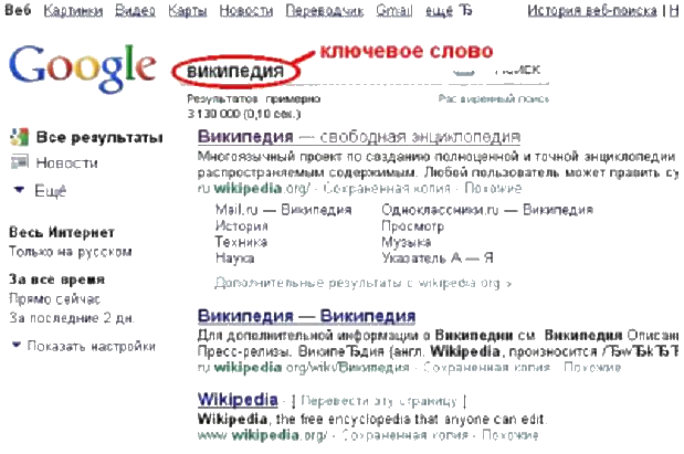 Ниже на рисунке представлен поиск энциклопедии «Википедия» в системе Google по ключевому слову, соответствующему названию энциклопедии.