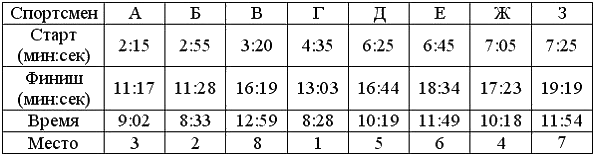 В соревнованиях по биатлону получен представленный таблицей протокол, в котором записано время старта и финиша спортсменов по секундомеру: