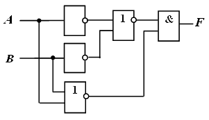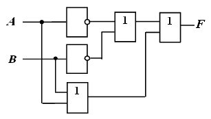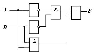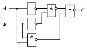 Если сравнить данную схему с исходной, то видно, что логический элемент ИЛИ, включенный на выходе исходной схемы, заменен на логический элемент И-НЕ с инверсией его входных сигналов в соответствии с законами де Моргана и двойного отрицания