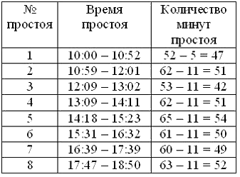 Для определения количества интервалов длительностью более 50 минут необходимо определить количество минут каждого простоя в рабочее время, учитывая время на посадку и высадку посетителей (в сумме 11 минут). Данные представлены в таблице: