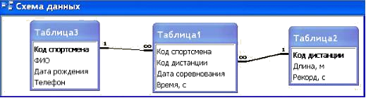 + таблицы 1 и 2 связаны через поля Код дистанции, таблицы 1 и 3 связаны через поля Код спортсмена