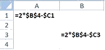Формула из ячейки A1 была скопирована в ячейку B3, то есть на один столбец правее и на две строки ниже. Поэтому ссылка $B$4 при копировании не изменилась, а ссылка $C1 изменилась на $С3.