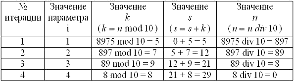 Данный алгоритм содержит цикл с параметром. В результате выполнения алгоритма выводится значение суммы цифр натурального числа
