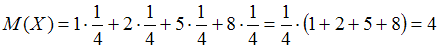 случайной величины, принимающей значения 1, 2, 5 и 8 с одинаковой вероятностью, равно …