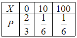 Игрок бросает игральную кость и получает 10 евро, если выпадает 5 очков, 100 евро, если выпадет 1 очко. В остальных случаях игрок не получает ничего. Закон распределения случайной величины
