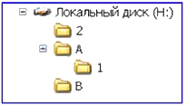 Папка A создается в корневом каталоге диска H: (например, командой контекстного меню «Создать – Папку»). Затем папку A надо раскрыть двойным щелчком мыши и создать в папке A вложенную папку 1. Затем папку A надо закрыть и на диске H: последовательно создать папки B и 2.