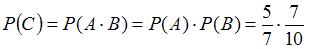 В первой урне 5 синих шаров и 2 желтых, а во второй – 7 синих и 3 оранжевых. Из каждой урны случайным образом извлекается 1 шар. Вероятность того, что вынуты оба шара одного цвета, вычисляется следующим образом …