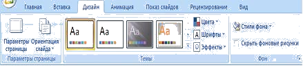 Набор команд вкладки «Дизайн» позволяет оформить презентацию таким образом, что она станет вполне «презентабельной», при этом не обязательно использовать оформление презентации на уровне отдельных слайдов. Эти команды позволяют воспользоваться готовыми цветовыми схемами, фоновыми текстурами и настроить ориентацию слайдов: