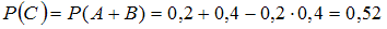Принтер признается не подлежащим ремонту при двух различных поломках. Вероятность поломки первого вида 0,2, а поломки второго вида 0,4. Поломки могут произойти как одновременно, так и отдельно. Вероятность списывания принтера, ввиду невозможности ремонта, равна …