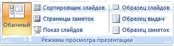 .Следовательно, на вкладке «Вид» находится группа команд «Режимы просмотра презентации»: