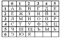 В закодированном сообщении полученные коды букв записываются подряд. Например, для буквы «У» номер строки – 4, номер столбца – 2. Код, соответствующий букве «У», – 42.