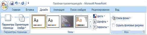 Заранее разработанные темы для быстрого изменения оформления презентаций в Microsoft PowerPoint 2007 можно найти на вкладке …