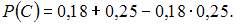 Статья не может быть принята в печать, если содержит опечатки, в ней присутствуют жаргонизмы, а также если наряду с опечатками она содержит жаргонизмы. 100 статей проверили по очереди двое редакторов. Первый определил, что среди 100 проверенных статей 18 содержат опечатки, а второй – что среди тех же 100 статей в 25 присутствуют жаргонизмы. Наугад выбрали 1 статью. Вероятность того, что она не будет принята в печать, вычисляется по формуле …