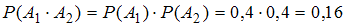 Вероятность бесперебойной работы станка в течение календарного года составляет 0,4. Тогда вероятность исправной работы станка в течение двух лет равна …