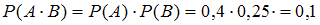 Вероятность того, что студент верно решит первую задачу, равна 0,4, а вероятность правильно решить вторую задачу не зависит от результата решения первой и составляет 0,25. Вероятность того, что студент решит верно обе предложенные задачи, равна …